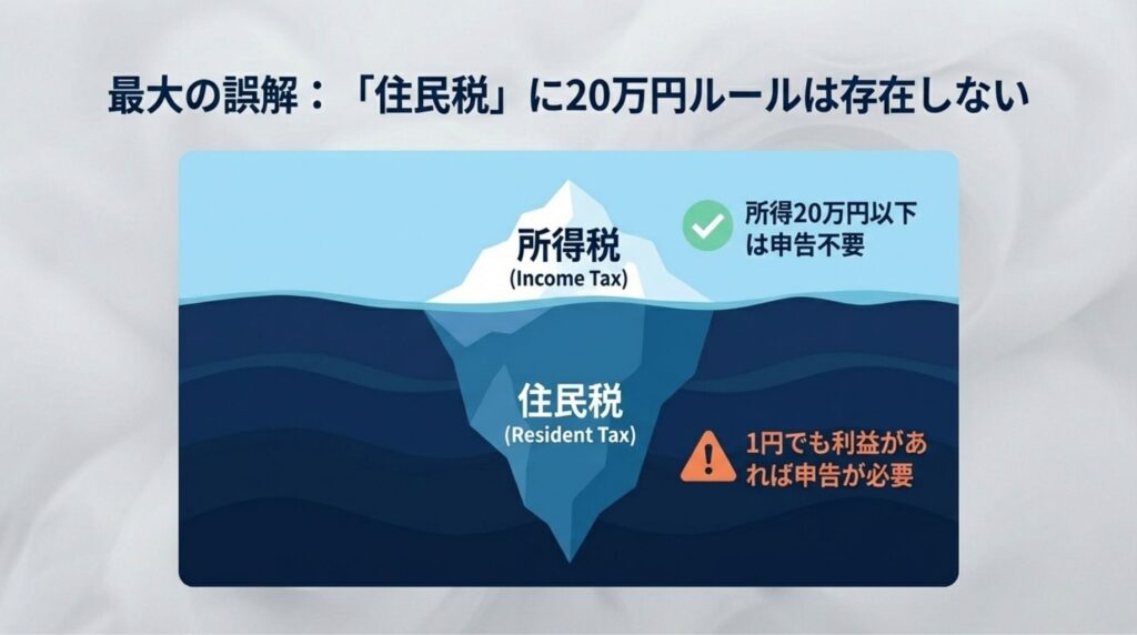 よくある誤解ですが、20万円以下で不要になるのは「所得税」の話だけです。「住民税」には20万円ルールが存在しません。 たとえ副業所得が1円でもあれば、お住まいの市区町村へ住民税の申告が必要になる場合があることは覚えておきましょう。