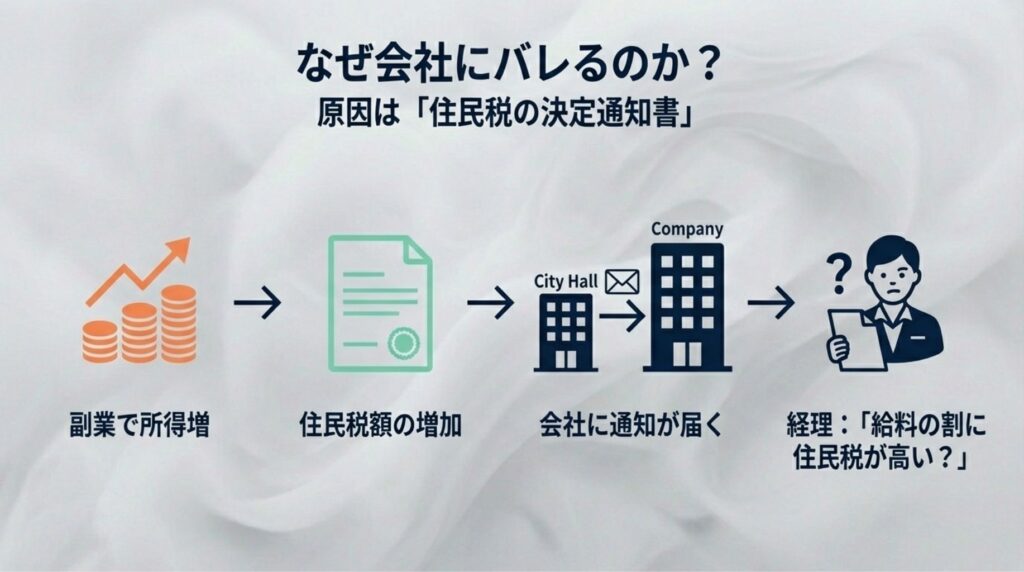 副業で所得が増えると住民税の額も上がります。それが会社に通知される際、「給料の割に住民税が高いな?」と経理担当者に気づかれてしまうのです。
