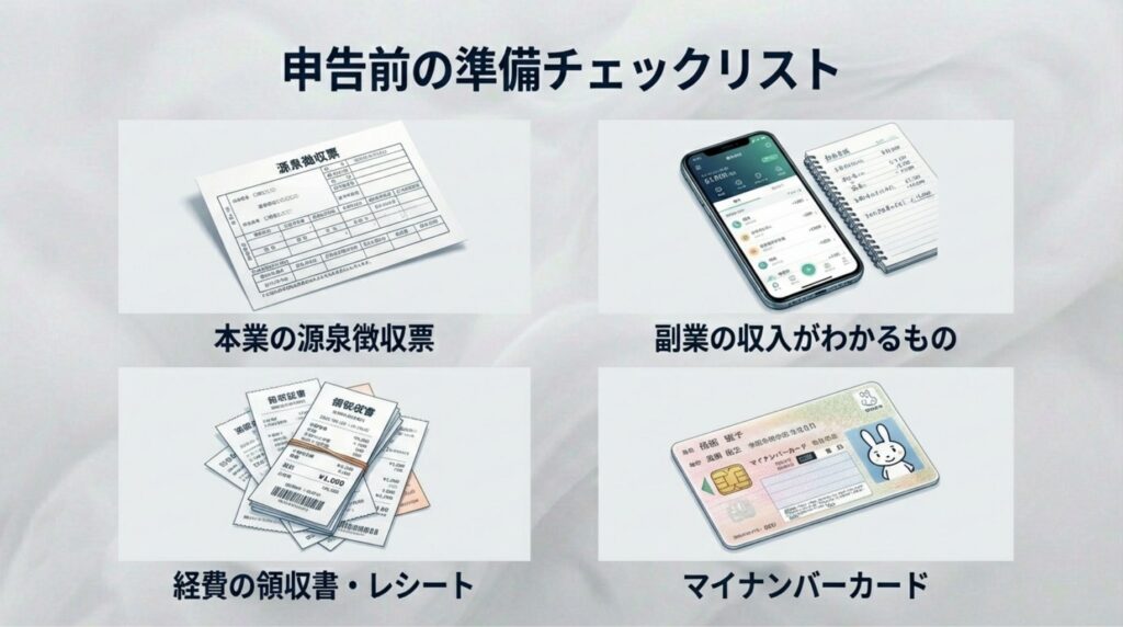 - 本業の源泉徴収票: 12月〜1月頃に会社からもらうもの。