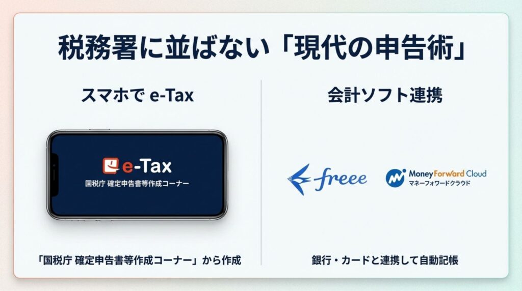 - スマホでe-Tax: 国税庁の「確定申告書等作成コーナー」から、スマホ一つで申告可能です。