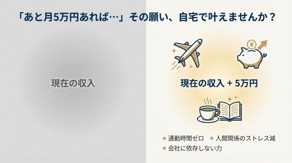 「今の収入にプラスして、あと月5万円あれば…」 そう考えた時、通勤の必要がなく、自宅で空いた時間にできる「在宅副業」は非常に魅力的ですよね。