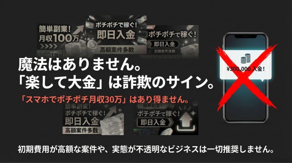 当サイト「JPN副業情報館」では、読者の皆様を守るため、初期費用が高額な案件や、実態が不透明なビジネスは一切推奨しません。 ここから先は、リスクが低く、安全性の高いものだけに絞って紹介します。
