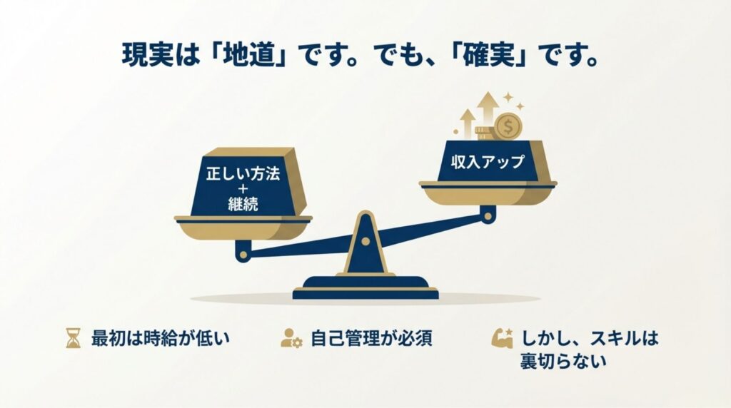 - 最初は「時給」が低い: スキルが身につくまでは、作業時間に対して収入が少なく感じる時期が必ずあります。