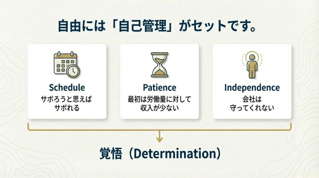 - 自己管理が必須: サボろうと思えばいくらでもサボれてしまいます。スケジュール管理能力が問われます。